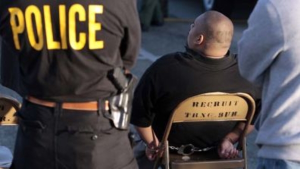 Law enforcement processes a suspected member of a Azusa, Calif. gang following an early-morning raid, at the at Irwindale Speedway in Irwindale, Calif., Tuesday, June 7, 2011. The Latino gang conspired to rid the Southern California city of its black residents through threats and violence dating back to the early 1990s, according to an indictment. (AP Photo/Jason Redmond)
